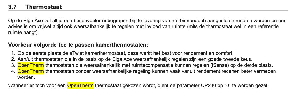 Ah. That’s unfortunate. I was reading a bit on the Remeha site, and it actually says the Elga Ace can be controlled by OpenTherm as well.