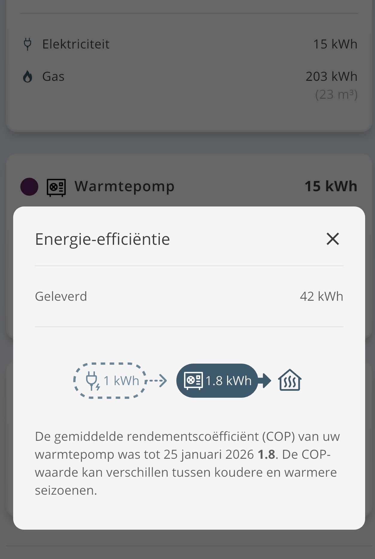 As an aside: a COP of 1.8 seems a bit low, mine is 4.6 and I can’t say I have a home that’s exceptionally well suited for a heat pump (“okay” insulation and only big old radiators, no under-floot heating).