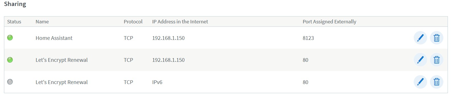 All I had to set up was 1 port forwarding for port 443 (I prefer “port-free” URLs, looks “cleaner” to me), both ex- & internally & externally, and 1 for port 80 (externally, mapped to 8000 internally) within the FritzBox interface & of course, instruct the Let’s Encrypt add-on to run on that port (bottom of its configuration tab).