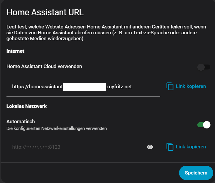 Add your myFritz domain (https://homeassistant.YourDomain.myfritz.net) as the Home Assistant Internet URL