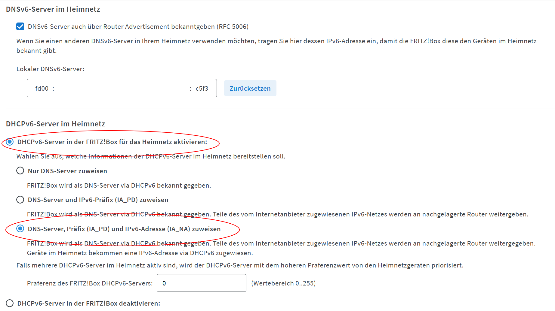 - enable “DHCPv6-Server in der FRITZ!Box für das Heimnetz aktivieren”