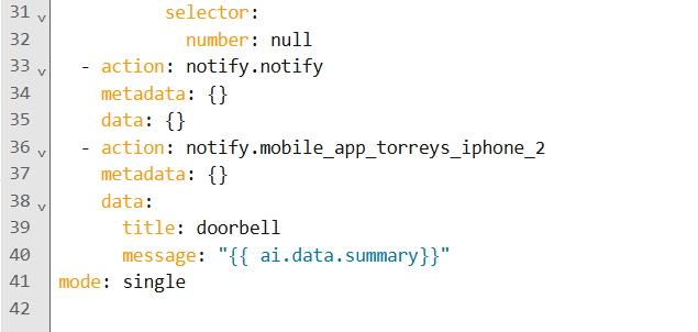 In the future, please try to post code snippets as text, not screenshots. They’re much harder to work with as screenshots. I think you have multiple errors in your code. In your ai_task.generate_data action, you have two “instructions” keys (delete the second one, it’s unneeded); also in ai_task.generate_data, you’re missing a response_variable (should be ‘ai’ to match the message template in your mobile phone notification); and last, you have an empty notify.notify action that does nothing because it has no data (delete it). For reference, here’s a snippet from one of my automations (not shown, a time trigger and a weather.get_forecasts action to pull the weather forecast into a response variable ‘weather’):