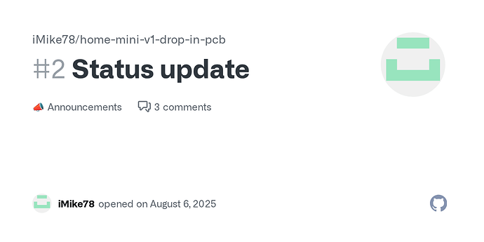 FYI, iMike78 posted an update saying that he recieved the first “Home Mini v1 test batch” (initial physical circuit board prototype test recieved from PCB manufacturer) and the hardware itself seems sound (pun intended) so ESPHome can be flashed to the ESP32 and working fine, but he is however having some problems with the XMOS firmware and is requesting help here → Status update · iMike78/home-mini-v1-drop-in-pcb · Discussion #2 · GitHub