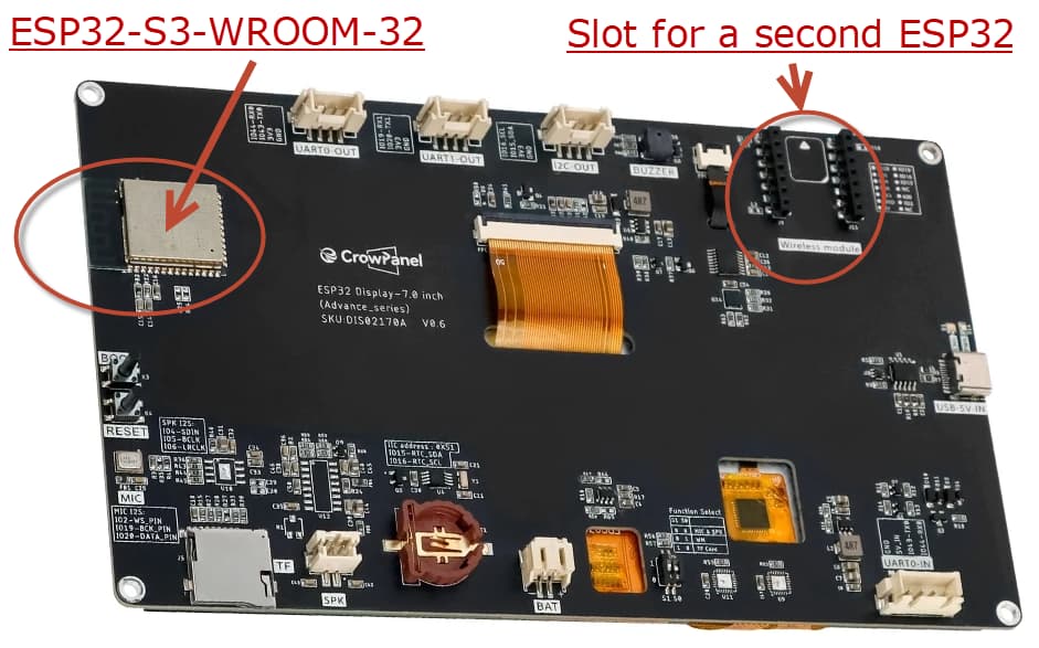 At least these “CrowPanel Advance” display series features “replaceable wireless modules” meaning that the ESP32 module can be replaced. That is, this article says that they feature an ESP32-S3-WROOM-1-N16R8 module soldered on the back + having a pin header taking ESP32-H2, ESP32-C6 or…