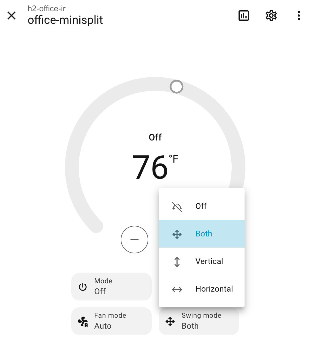 - Or, esphome can offer mappings to override default behavior. Maybe an optional, off-by-default setting that tells it to send left + right vane controls. Maybe an option that maps Swing or Auto to a fixed vane position.