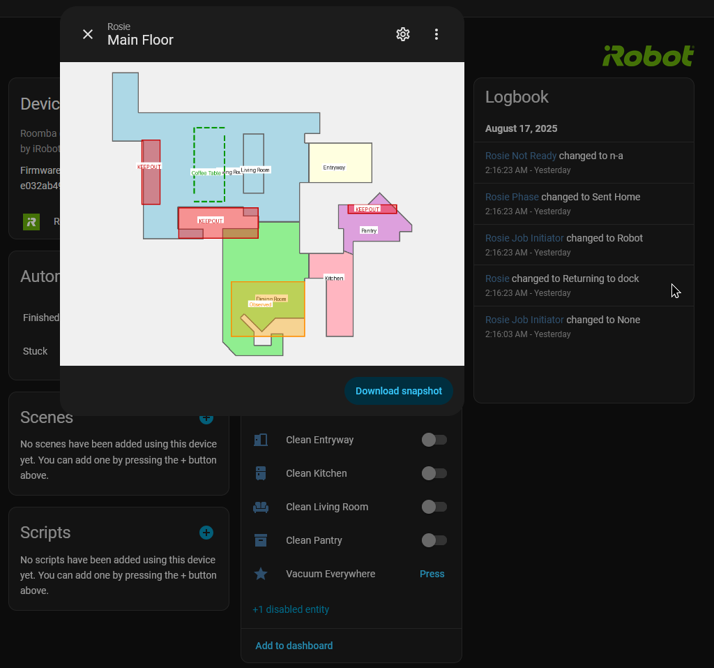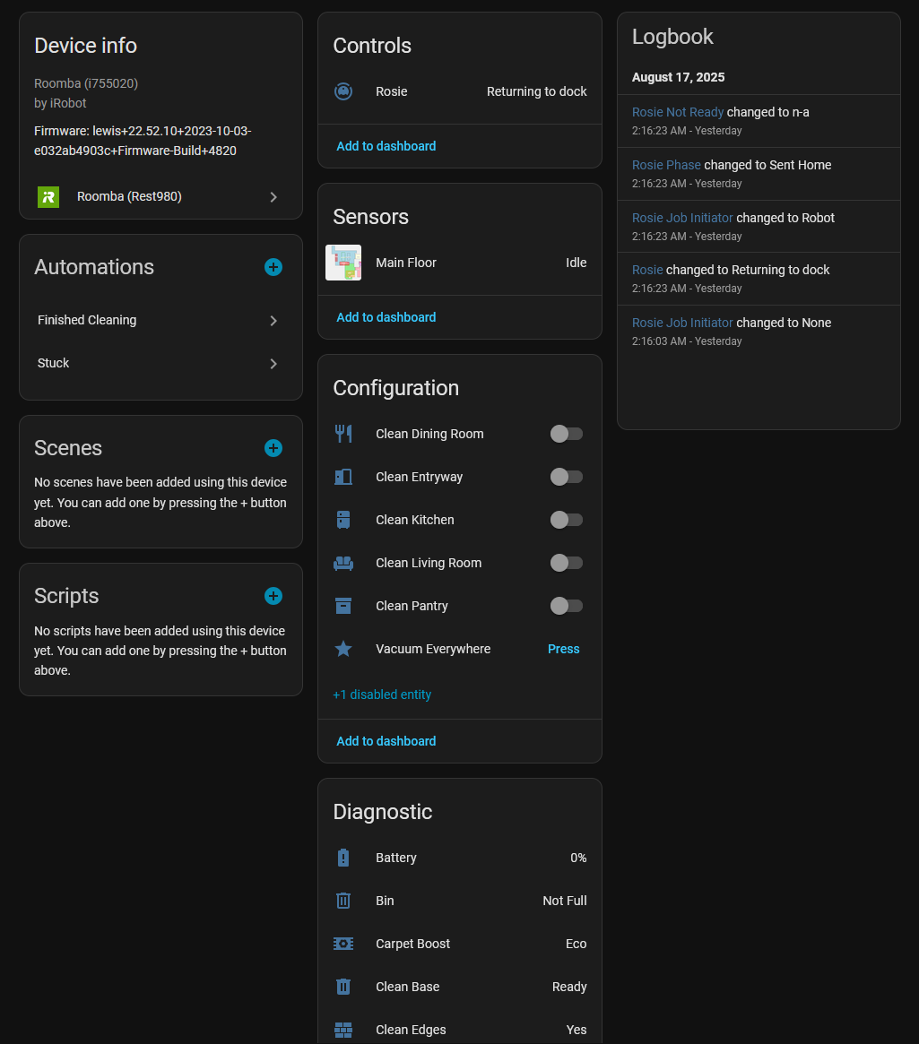 My robot is actually dead as of posting (why battery is 0%, my dock has issues making contact) but here’s the integration working! I’ll replace the images when I fully charge it. Besides that, the state is what was last before it died.