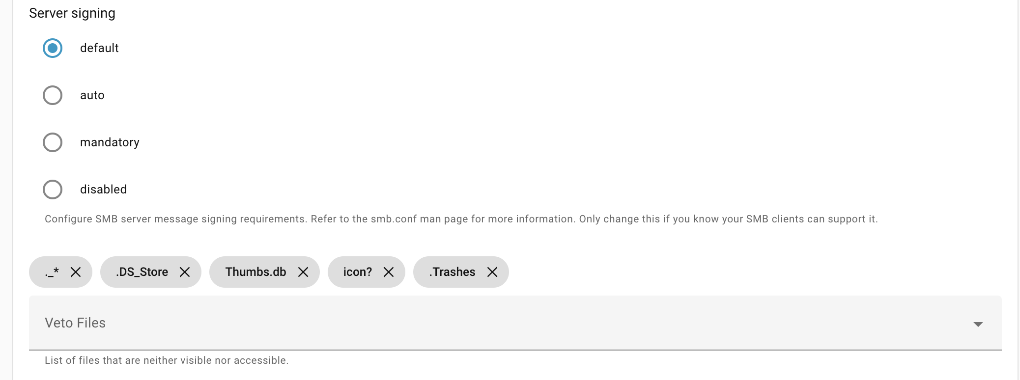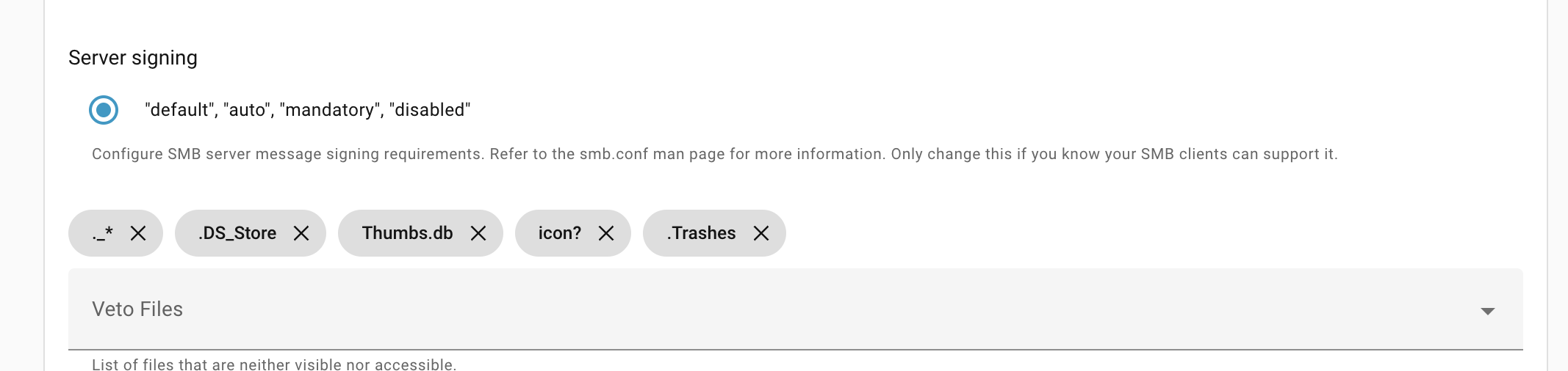 Failed to save add-on configuration, value must be one of ['"default", "auto", "mandatory", "disabled"']. Got {'username': 'homeassistant', 'password': 'issuance_lave9MISLIKE', 'workgroup': 'WORKGROUP', 'local_master': True, 'enabled_shares': ['addons', 'addon_configs', 'backup', 'config', 'media', 'share', 'ssl'], 'compatibility_mode': False, 'apple_compatibility_mode': True, 'server_signing': 'default', 'veto_files': ['._*', '.DS_Store', 'Thumbs.db', 'icon?', '.Trashes'], 'allow_hosts': ['10.0.0.0/8', '172.16.0.0/12', '192.168.0.0/16', '169.254.0.0/16', 'fe80::/10', 'fc00::/7', '192.168.1.0/24']}