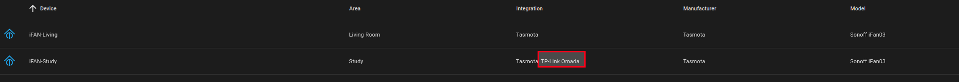 I have two Sonoff iFan3 controllers, both flashed with the latest Tasmota firmware, linked to the same wifi accesspoint and connected to the same MQTT system. I found that HA was listing one of them under two integrations. Any idea why that is and how I can ensure they will only be listed under the proper integration?