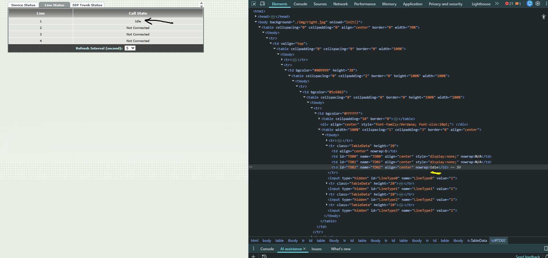 I´m trying to scrape my FXO gateway status from its web config page without any sucess for last two weeks. I tried using both scrape & multiscrape integrations. below is a screenshot of Inspect page.