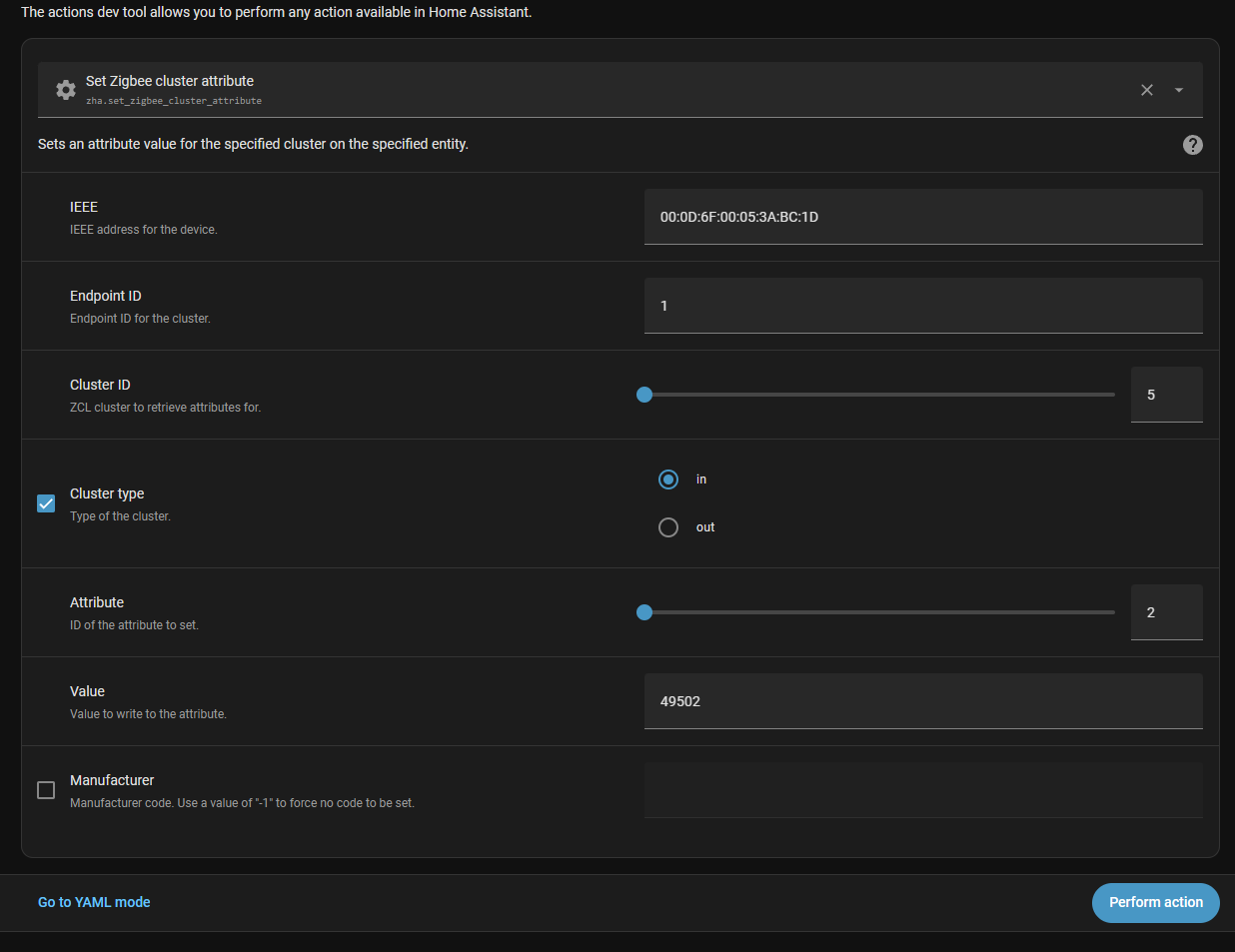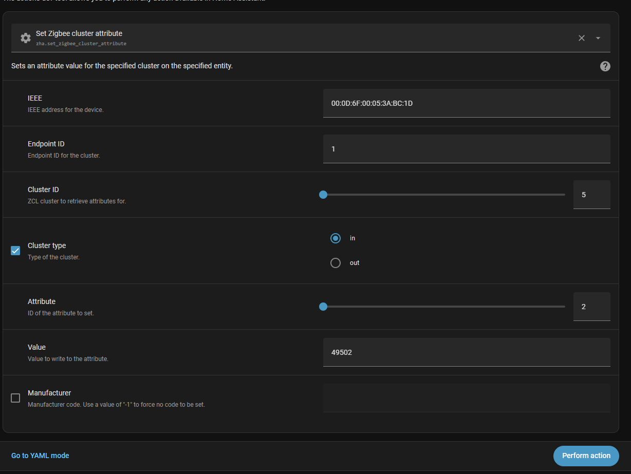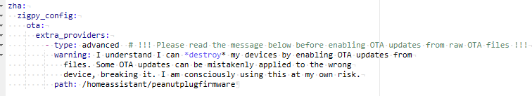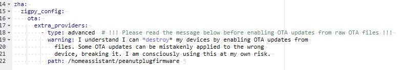 I tried to delete and re-add and I noticed the firmware was back to the original. I tried to update the firmware and get the warning below. My best guess is that the firmware update isn’t going through although the device shows the updated firmware (0x00000027) after running the set zigbee cluster attribute. I went back and made sure I was following the write up. I even tried changing the cluster type with the same results as suggested in the write up. Any ideas?? The write is quite old, perhaps something has broken this with the HA updates?