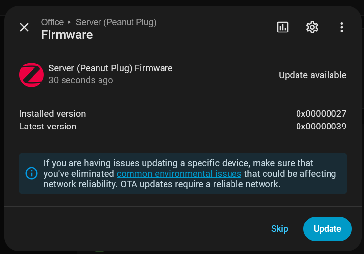 I tried that. Still no luck. The plug flashes green to red, then turns solid red. I left it for about 30 minutes. No option to update firmware. Then I tried unplugging it for about 15 seconds and plugging it back in. Still no option to update firmware. Perhaps I’m doing something wrong (I’ve only been on HA for a few weeks)? I just can’t see what’s wrong. I’d really like to get this figured out as I have 10 of these peanut plugs.