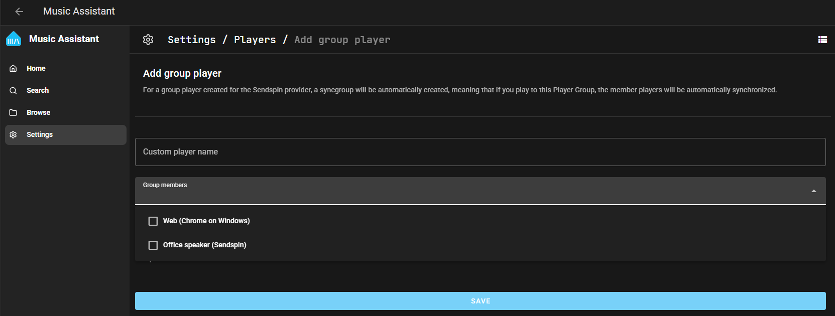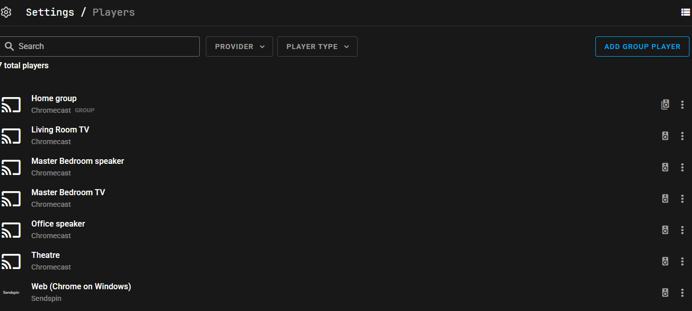 Running 2.7.2 Music Assistant and under Players I have all of my Chromecast devices listed (5), but when I try and create a group in Settings / Player section to put them all into one group under Sendspin it only list my "Web (Chrome on Windows) device and non of my Chromecast device?
