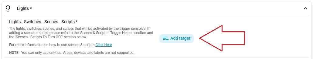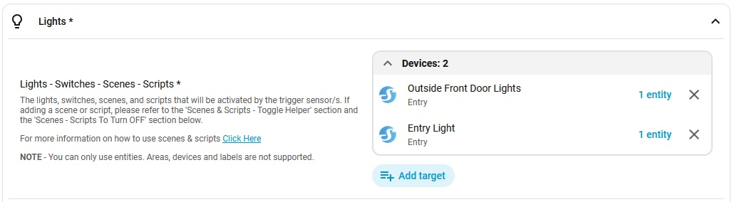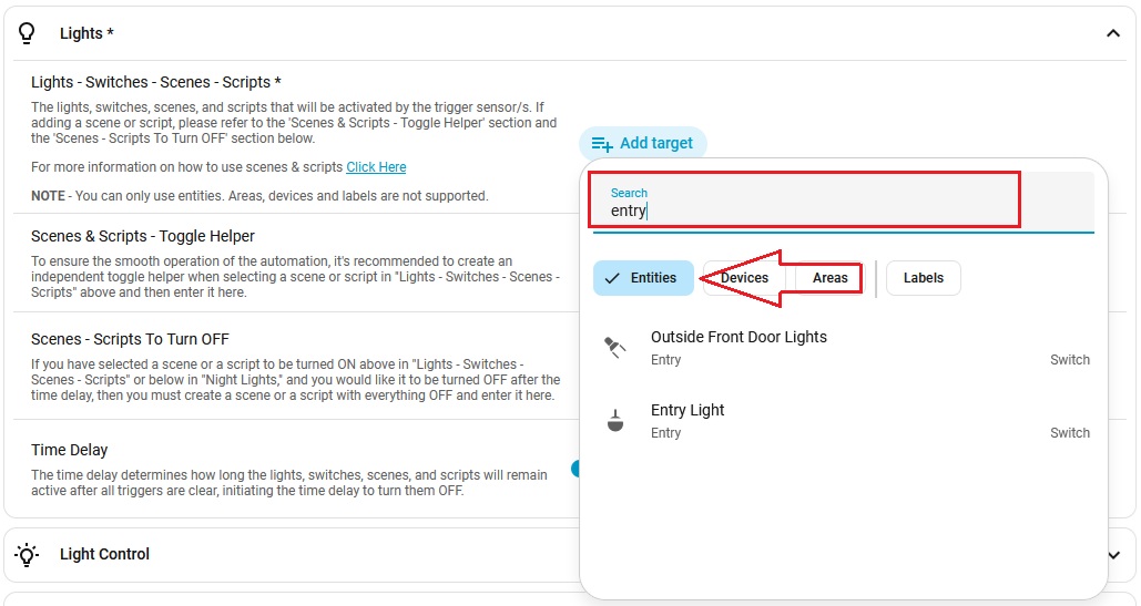 To fix this, click the expand button β<>β as shown below. This will break down your selected Areas, Devices, and Labels into individual entities. Ensure that all selections are green and consist only of entities. The same applies to βNight Lights.β