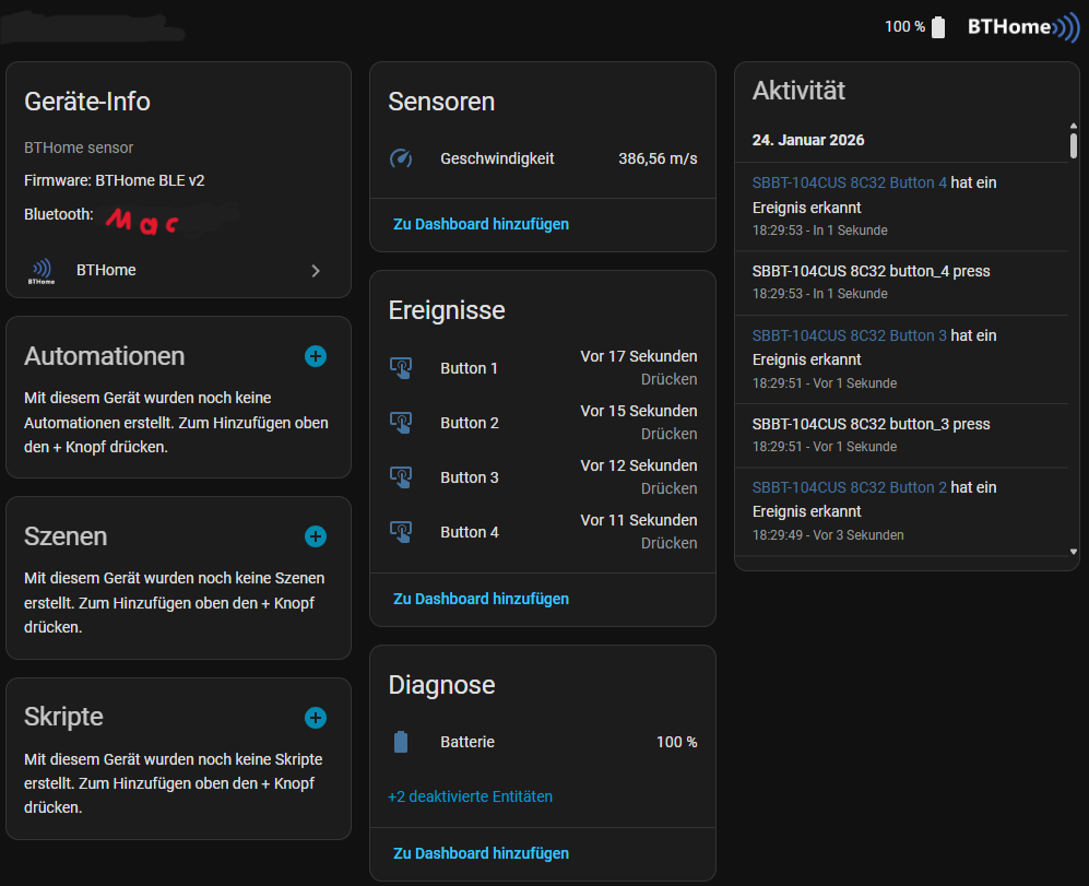When I press a button on the Shelly Blu RC Button 4 ZB, only one event occurs in the Zigbee device (As seen in the first picture) , and a separate button press triggers in BTHome (As seen in the second image).