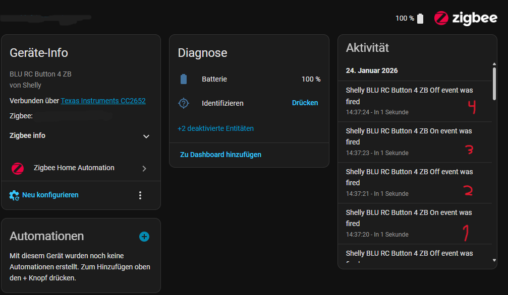 I recently bought two Shelly Blu RC Button 4 ZB devices and wanted to use them via Zigbee. I managed to connect them to Home Assistant via Zigbee, but it’s not showing up as four buttons. Buttons 1 and 3 are sending an “On” event, and buttons 2 and 4 are sending an “Off” event.