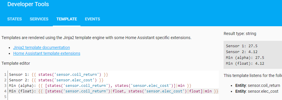 A sensor’s state is always a string, even if it looks like a number — "4" is not the same as 4. To run min on states, they need converting to numbers first, which is what the float filter does (or int, if you want an integer result).