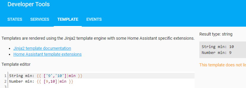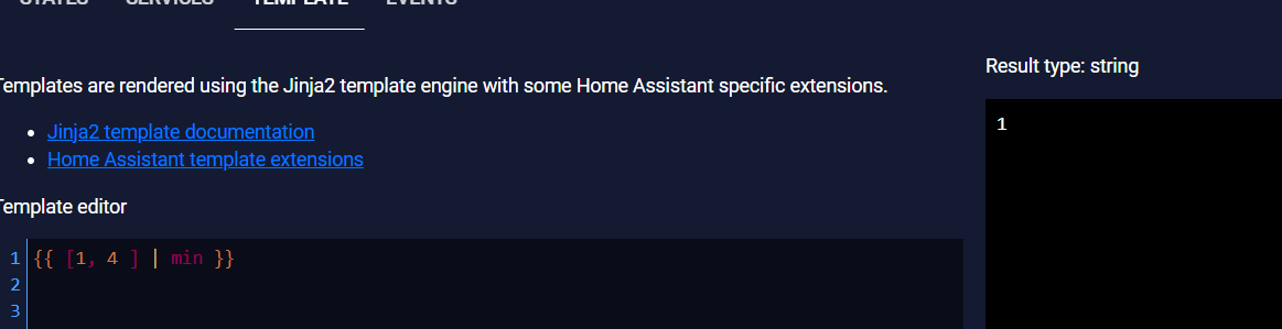 In the templating language, lists are defined like this: {{ [1, 2, 3] }}. The min filter works on a list, so this would give 4: {{ [7, 4, 9, 11]|min }}.