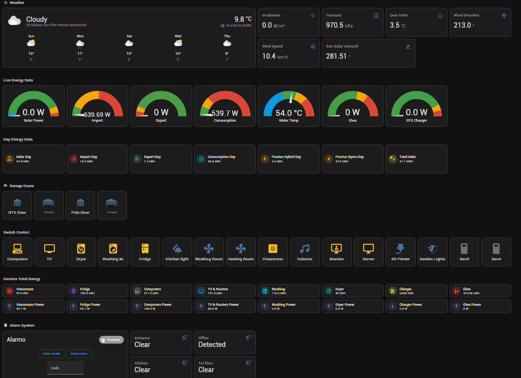 Here I would like to introduce you my dashboard and provide you with a detailed overview. The dashboard is based on the new tile design in HA. The structure of the dashboard has grown a lot since then and an overview is good for me, too. The dashboard is adapted for tablet view. If possible, you shouldn’t have to scroll, but in some places it just can’t be avoided. In addition, the larger cards are broken up in the layout on the mobile phone and are therefore also displayed quite well. Development is continuing and I will try to maintain the current status of the dashboard at github. Also I will record current updates on github. English ReadMe is attached since today.