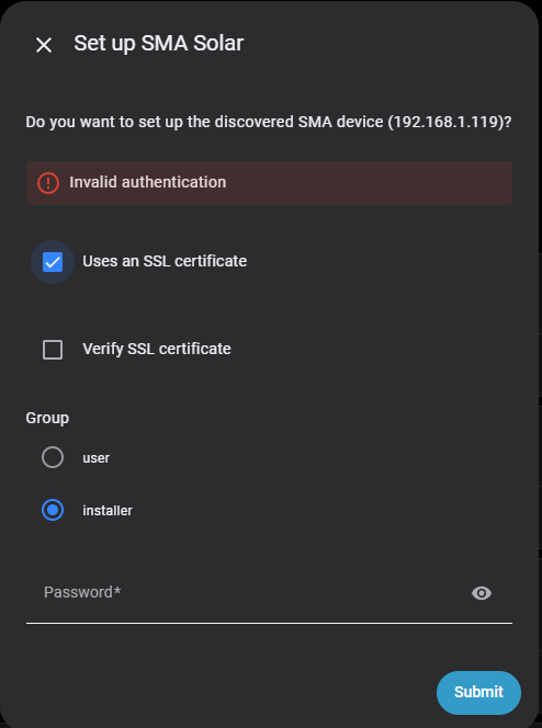 When in HA, I want to add the SMA, it requests a password, so I enter the password used. With use SSL verification and/or verify SSL checked or unchecked it fails (or failed to connect or authentication failed) whether I use user or installer.