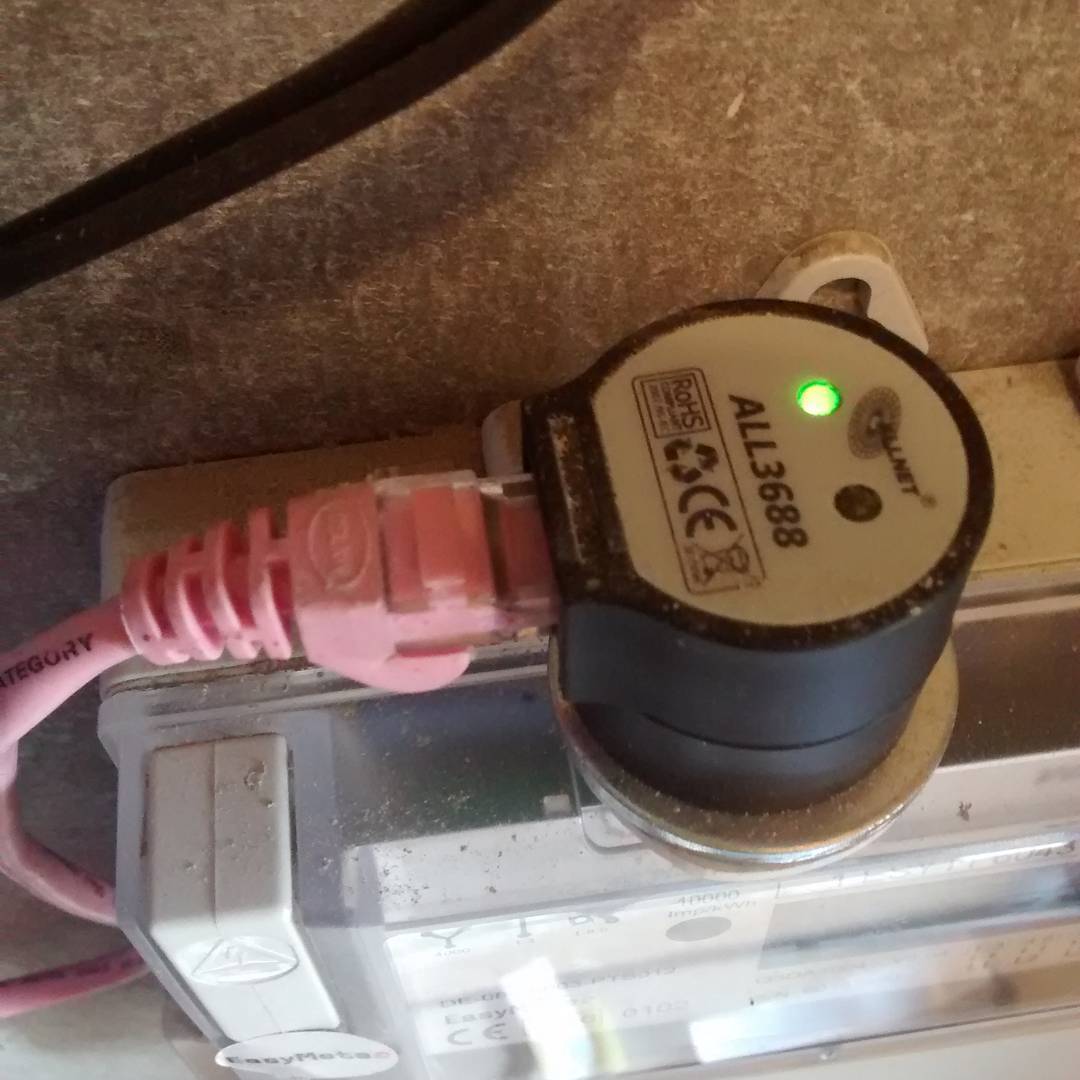 To link my meter to vzlogger I needed an interface to link up my meter to a raspberry pi. Many meters have RS485 output, which is cheap and easy even on a raspberry pi, some have the very simple “S0” interface, which works too, and others have optical interfaces, like my Q3D: You need an optoelectrical reading head (basically half an optocoupler, the other one is in the meter) to get a signal to a serial line. One benefit is that thiis signal can be read out without touching any dangerous parts. I bought the Allnet ALL3688, but there are many other options, and circuit diagrams to wire up a phototransistor and a few censts wort of parts to do the same thing are floating around.
