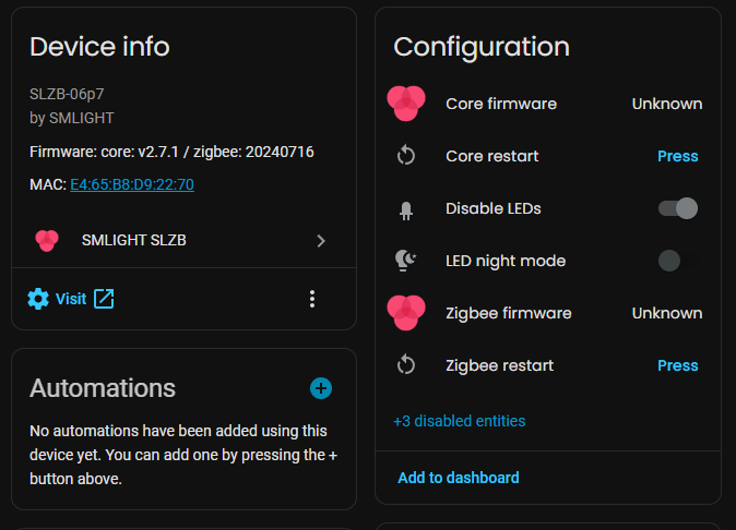 I also tried installing the SLZB integration to possibly update that way, but core firmware and zigbee firmware versions are “unknown” despite being reported in the device info