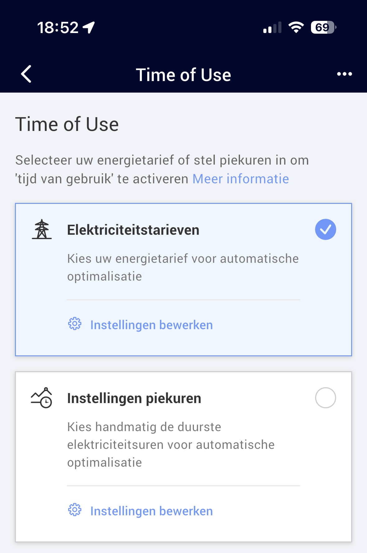 I can set different options in the SolarEdge app. With ‘Time of use’ I can use dynamic tariffs. You don’t have this?