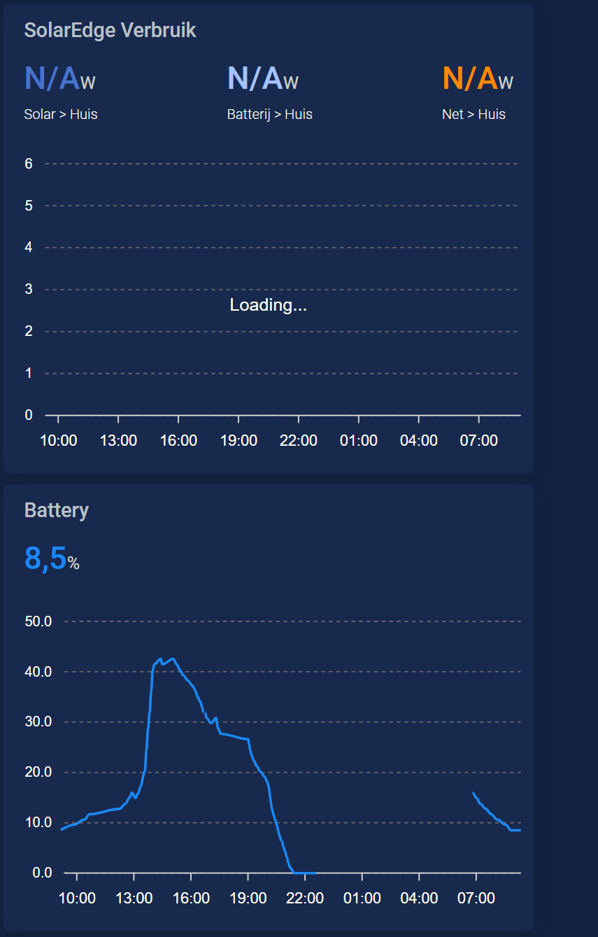 That’s hard to tell what is going wrong. N/A means not available I think? Follow the sensor: sensor.solar_panel_to_house_w. This is the Solar > Huis sensor. Is it named the same in your configuration? If not, then probably the other ones are also named different. Do al the sensors work if you recreate this dashboard: SolarEdge Modbus Multi config for Single Inverter, Battery and Backup Module/Meter - #4 by jrebergen