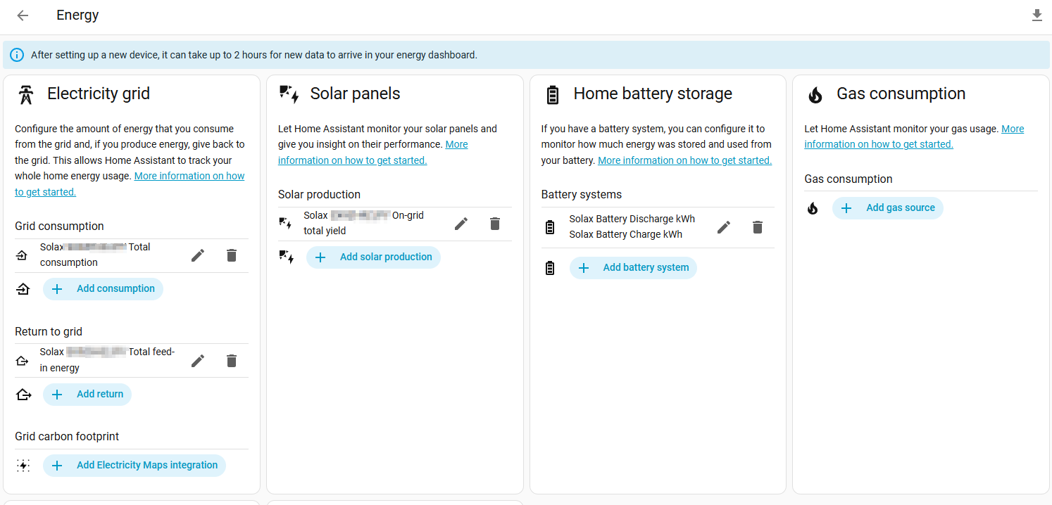 I arranged it in a way is following the instrucitons at SolaX Power - Home Assistant: total consumption for grid consumption, total feed-in for return to grid, on-grid total yeld for solar production.