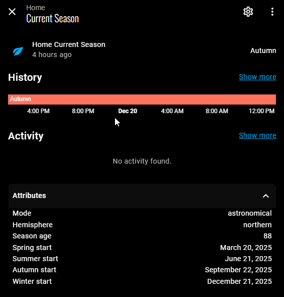 A user requested a way to calculate season progress. They discovered that winter_start becomes useless in January - it shows December 2025 when you’re actually in the winter that started December 2024. The attribute jumps to the next calendar year’s value.