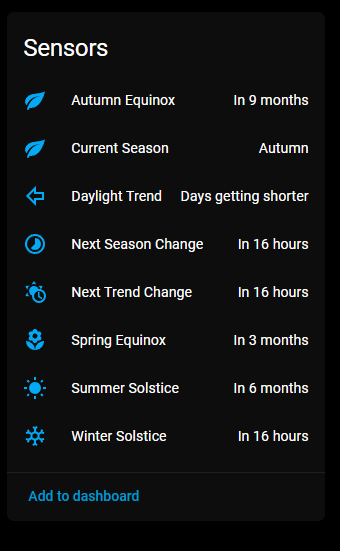 It’s inspired by the built-in Season integration, but I wanted something more detailed — precise timestamps, daylight trends, and information that actually reflects how the year progresses. So I built it.