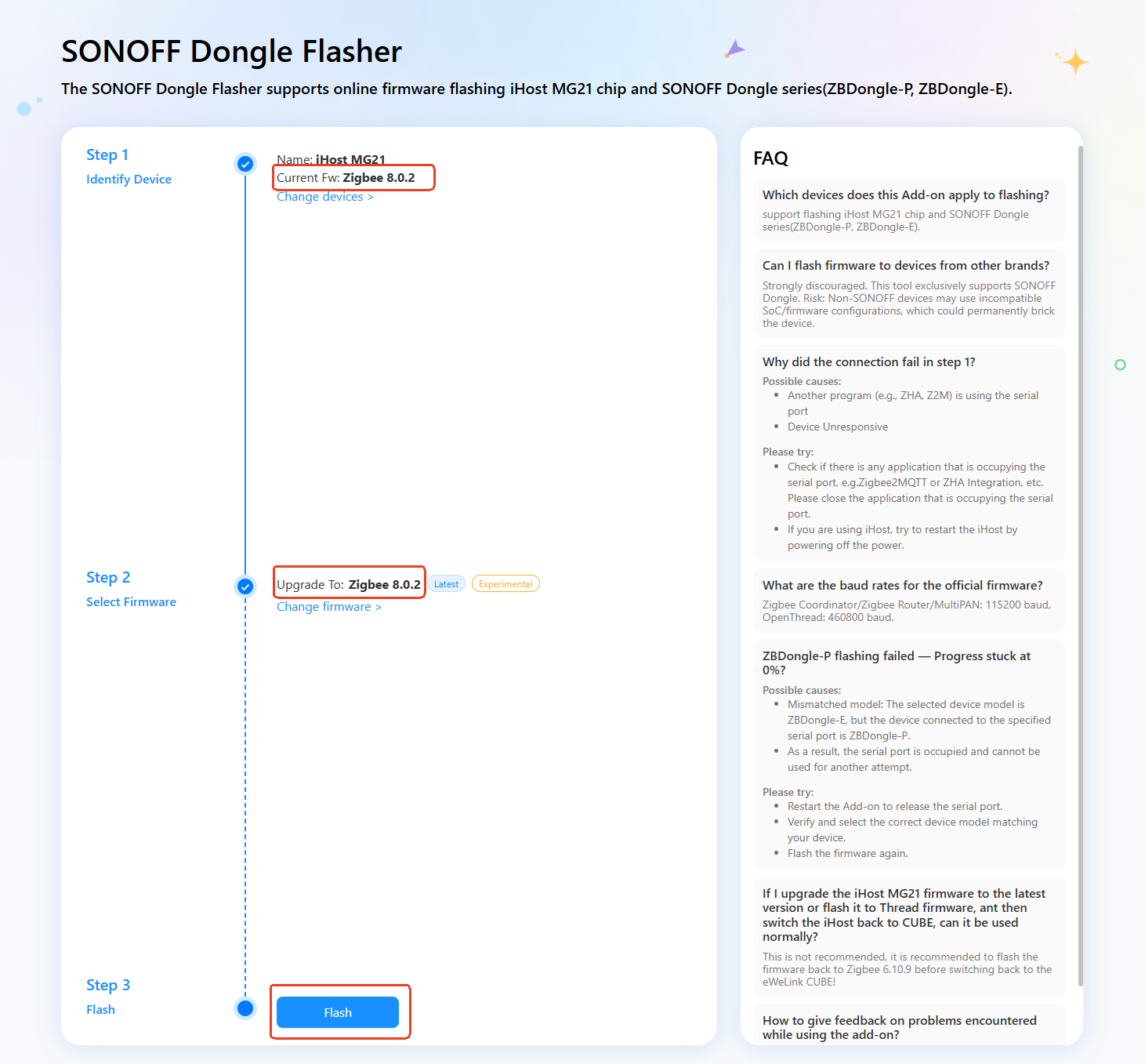 SONOFF has developed a Web tool called SONOFF Dongle Flasher which makes it very easy to manage ZBDongle’s firmware. But it has one drawback: it requires users to has physical access to the ZBDongle (unplug the ZBDongle from HA, and then plug it to a PC/MAC), which means users can not do the flashing remotely.