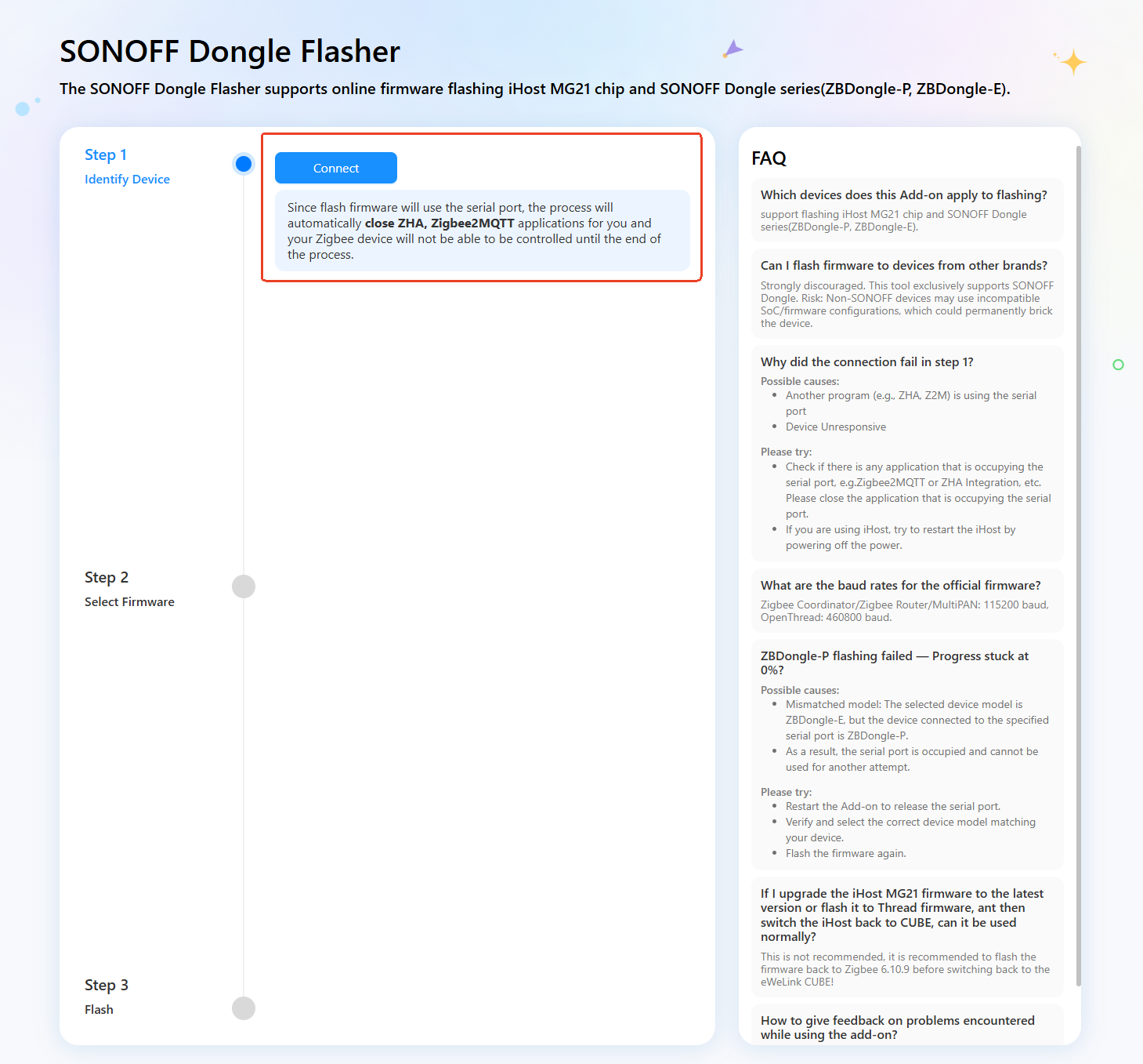 There is a note saying Since flash firmware will use the serial port, the process will automatically close ZHA, Zigbee2MQTT applications for you and your Zigbee device will not be able to be controlled until the end of the process. below the Connect button.