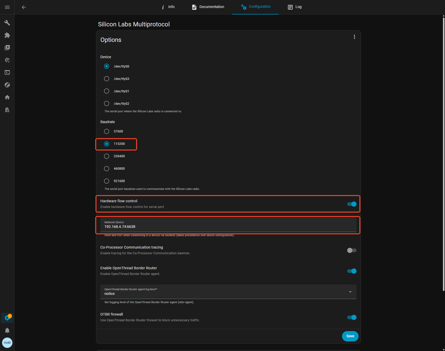 - What’s the serial configuration of your Zigbee2MQTT app (
