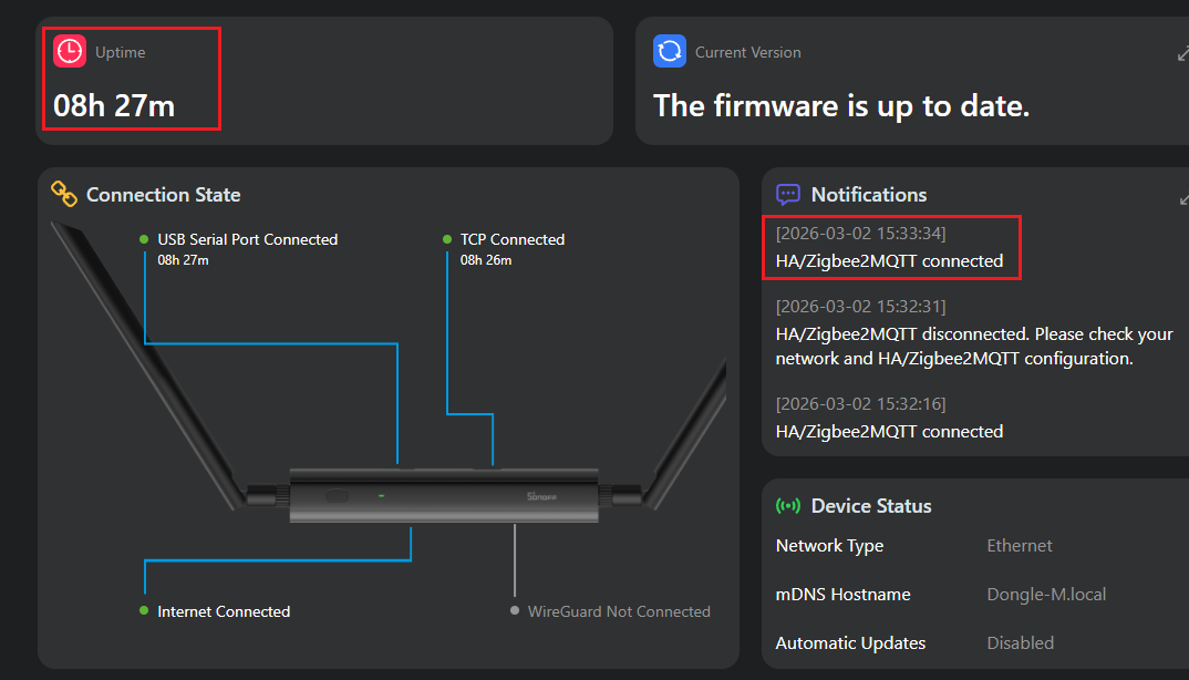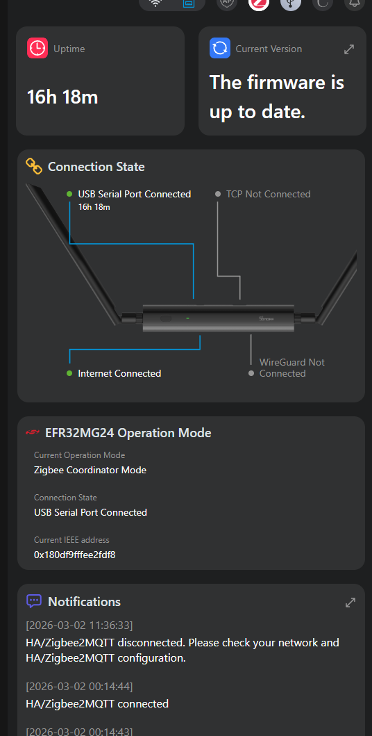 And zigbee2mqtt currently can’t communicate properly with the dongle when it is in MultiPAN mode. Let me know if there are new releases, I would be happy to test them.