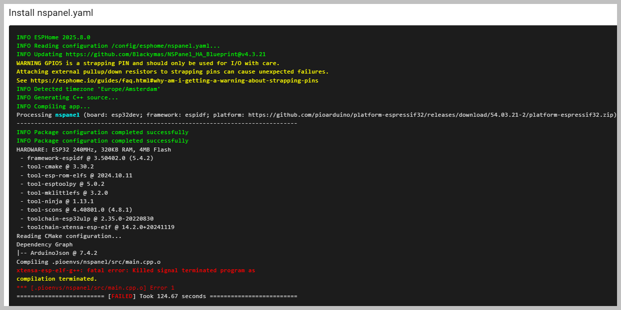 [140226277290720] Error during service call to update.install: Error compiling nspanel.yaml; Try again in ESPHome dashboard for more information