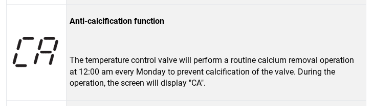 The manual states that the device performs a routine calcium removal operation (“CA”) every Monday at 12:00 AM.