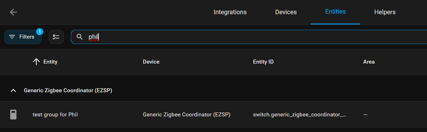 So then I created a brand new group within Sonoff ZHA for the lounge lights. And even after a reboot it does not show in entities. and I have tried searching and clearing filters.