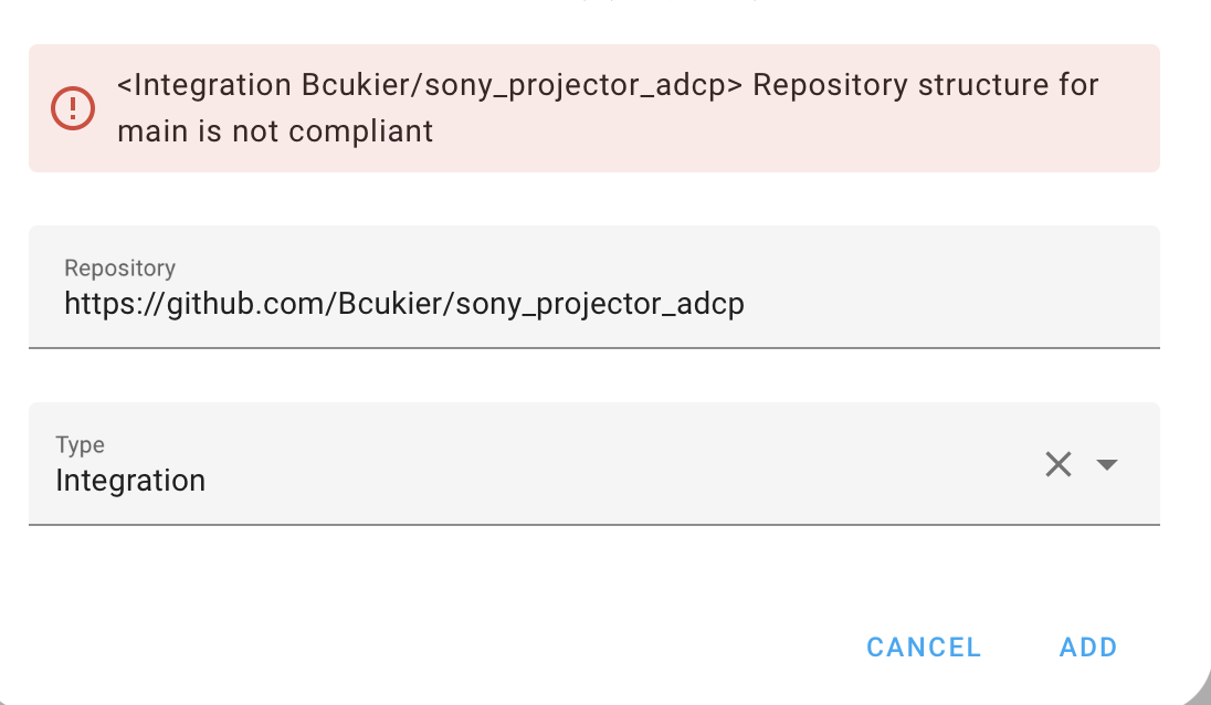 This custom integration allows you to control Sony projectors (specifically the VPL-XW5000 and compatible models) using the ADCP (Advanced Display Control Protocol) over your local network.
