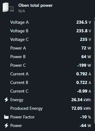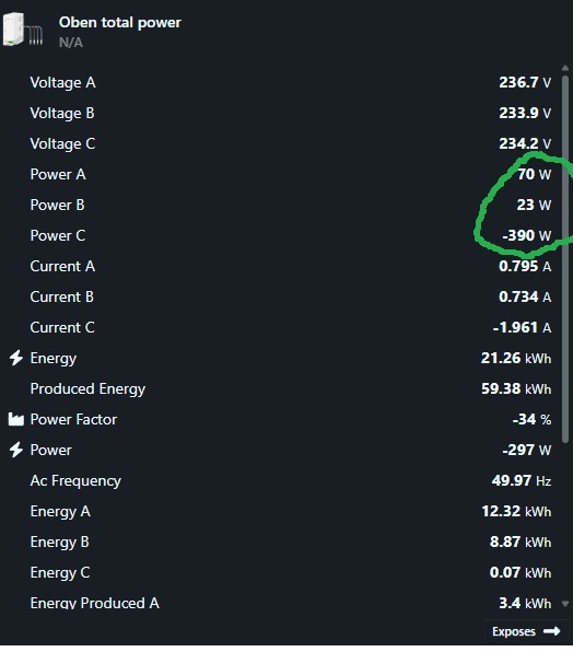 However, one phase, phase c, always displays negative. my house runs at around 500w when im my pc is on, i know this from measureing other devices and i have a seperate smart power meter for my office, but my power from the main 3 phase meter looks like this.