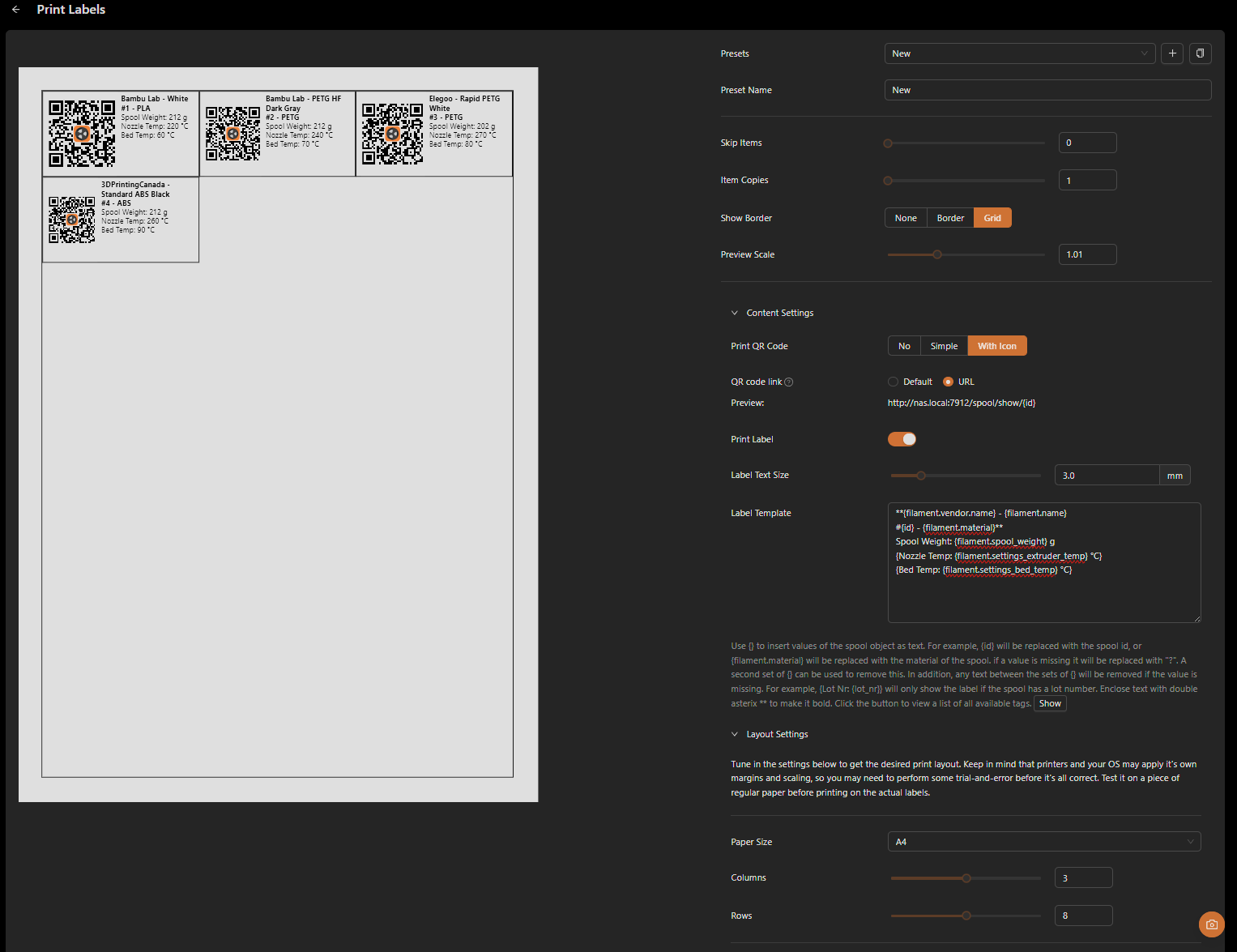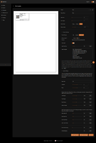 @larathydo The latest v1.1.2 release has QR code generation for full label/sticker sheets (multiple paper sizes, configurable grid layout, margins, spacing, etc.) similar to Spoolman’s label printing.