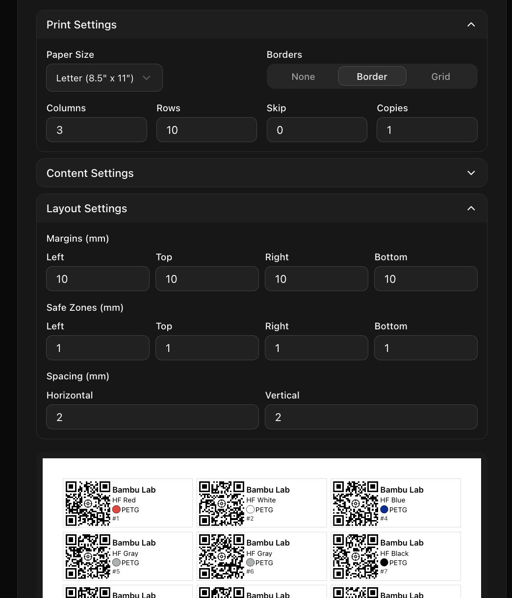 Would it be possible to leverage the same kind of UI design that Spoolman’s QR code generator uses? It’s approach is particularly useful for these kind of label sheets to dial in positioning / accommodating placement for different types of label sheets: