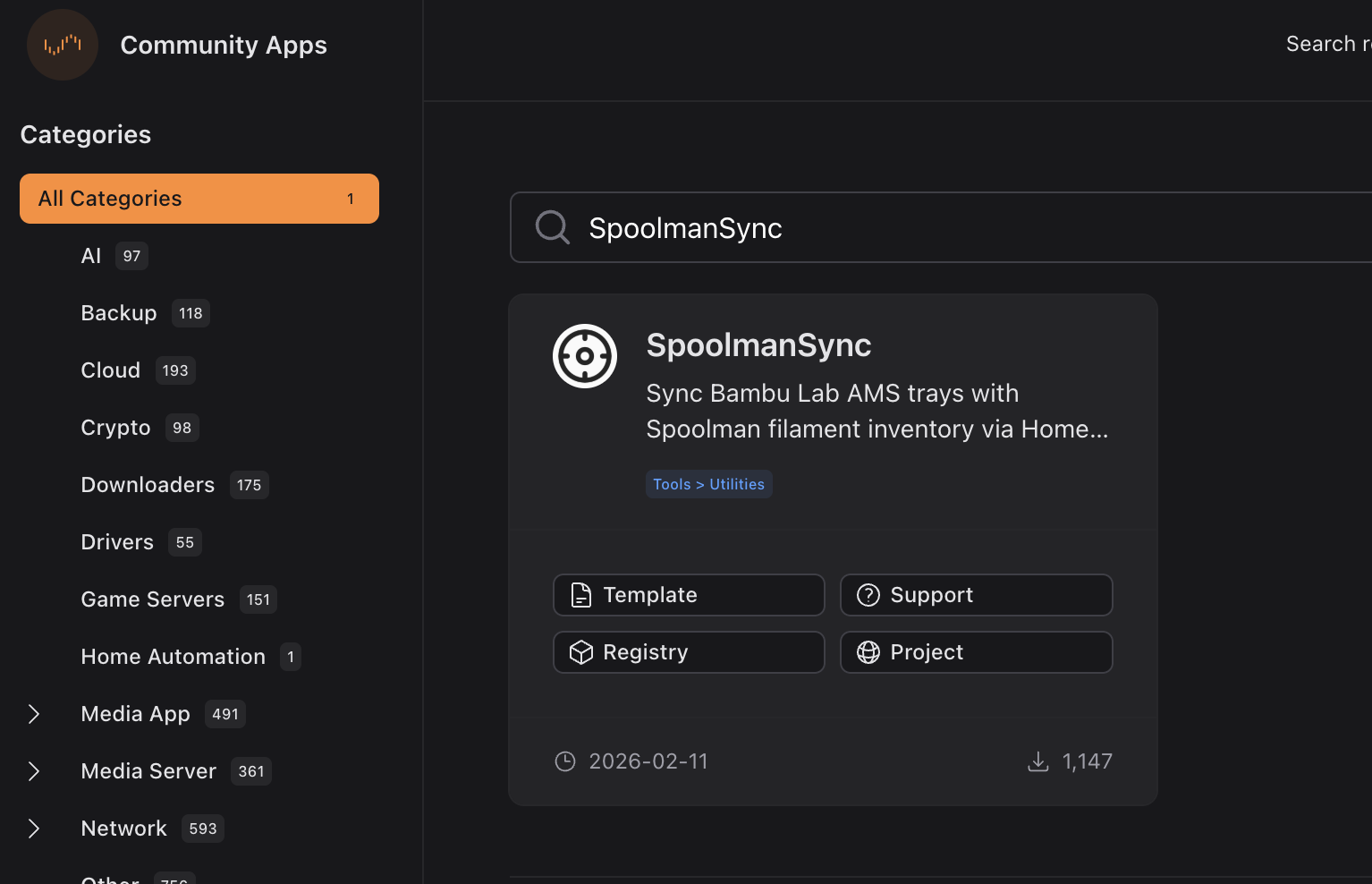 SpoolmanSync has been added to Unraid Community Apps. I don’t have Unraid to test with, so if you give it a try please let me know if you run into any issues!