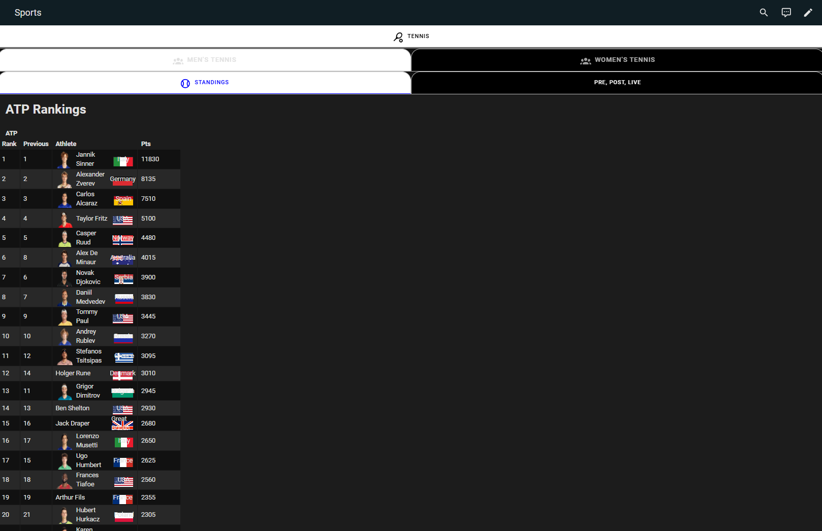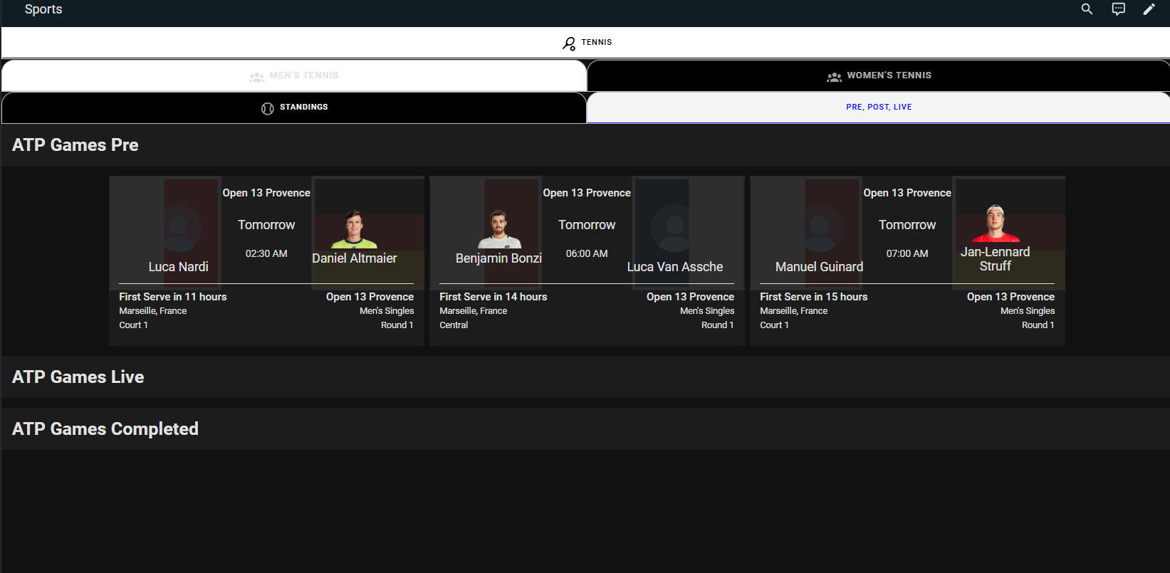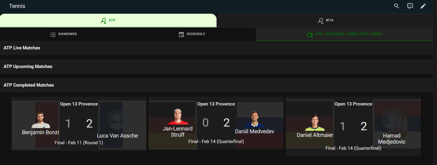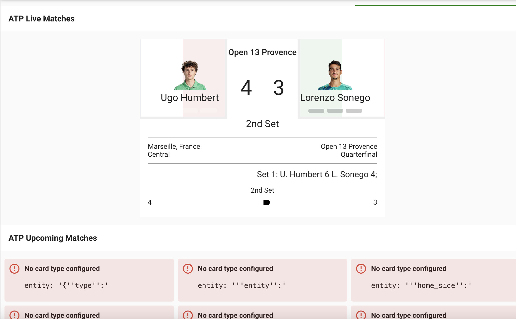Anyway for fun I looked at https://site.web.api.espn.com/apis/site/v2/sports/tennis/atp/scoreboard  to see what players were either in pre/in/post mode which is one of the items TT keys off of.  I saw a couple and put them into my tennis.yaml sensor file.  Here are the 4 I grabbed (I am not doing all 150 and would love to have someone post it if they get an itch to create them and I would put them on my github site).