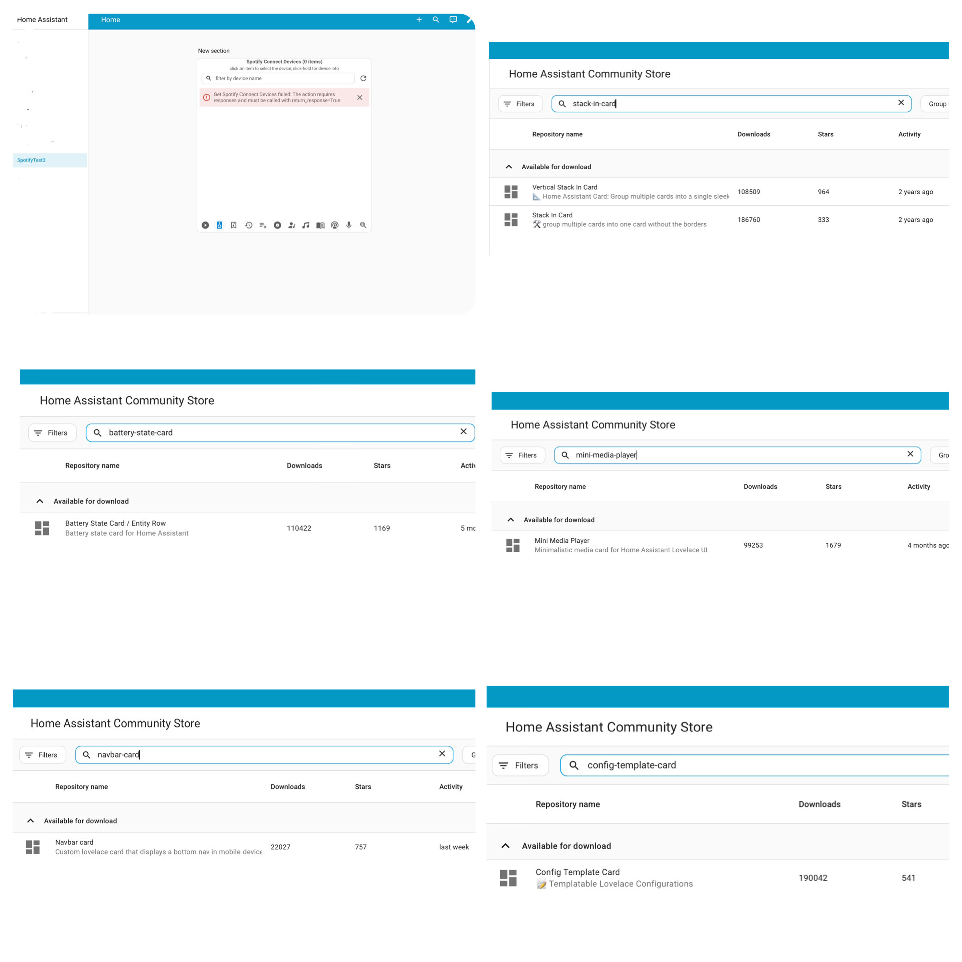 Try the following … move all folders (except the spotifyplus_card ) out from the /config/www/community folder. Then restart HA and clear your browser cache (including cookies). At this point, the SpotifyPlus Card should start working. You can then copy each of the folders back (one-by-one), hard-refreshing the browser after each folder is copied back and clicking on the SpotifyPlus Card devices refresh button to refresh the list.
