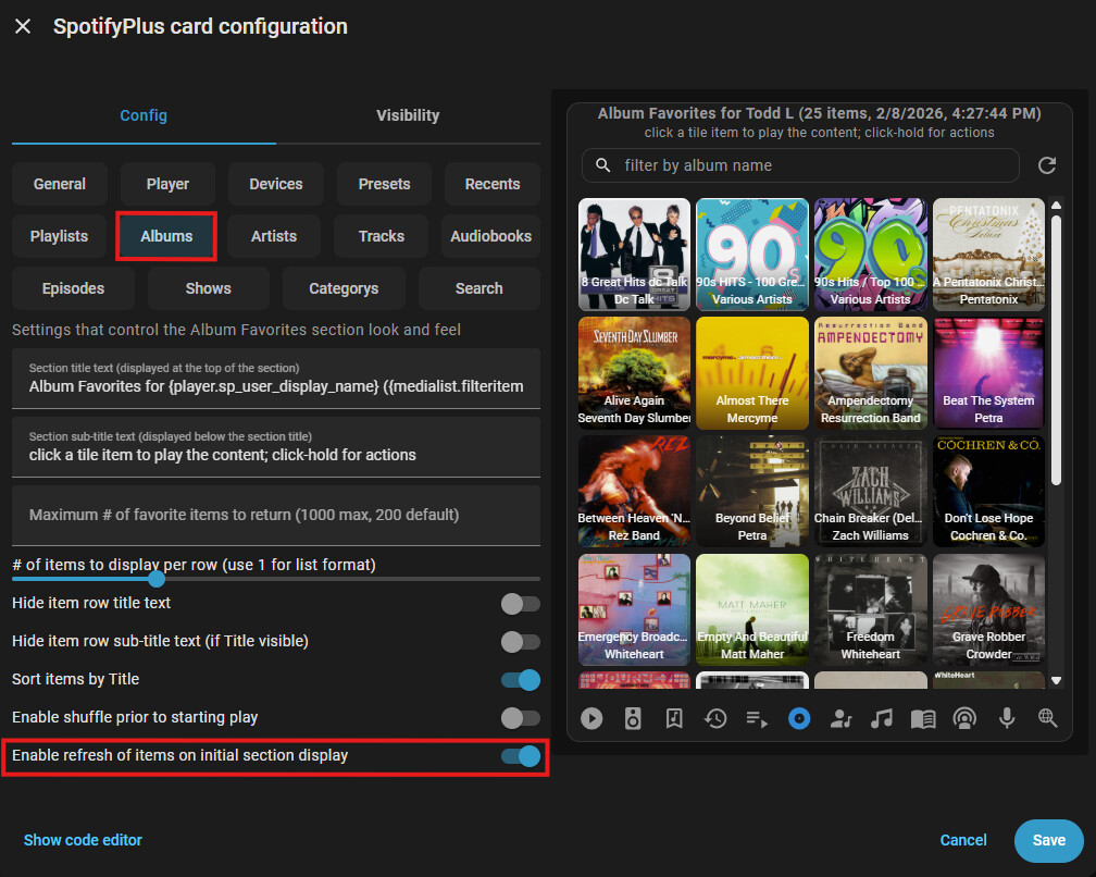 Added card configuration option albumFavBrowserItemsRefreshOnEntry; True to enable refresh of Album Favorites media browser items on initial section display; otherwise, False to use cached data (faster rendering).