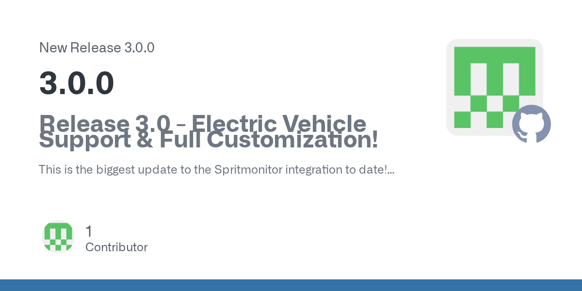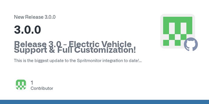 This is the biggest update to the Spritmonitor integration to date! Version 3.0 has been largely rewritten from the ground up to be more powerful, flexible, and compatible than ever before. It introduces full support for electric vehicles and complete customization through the UI.