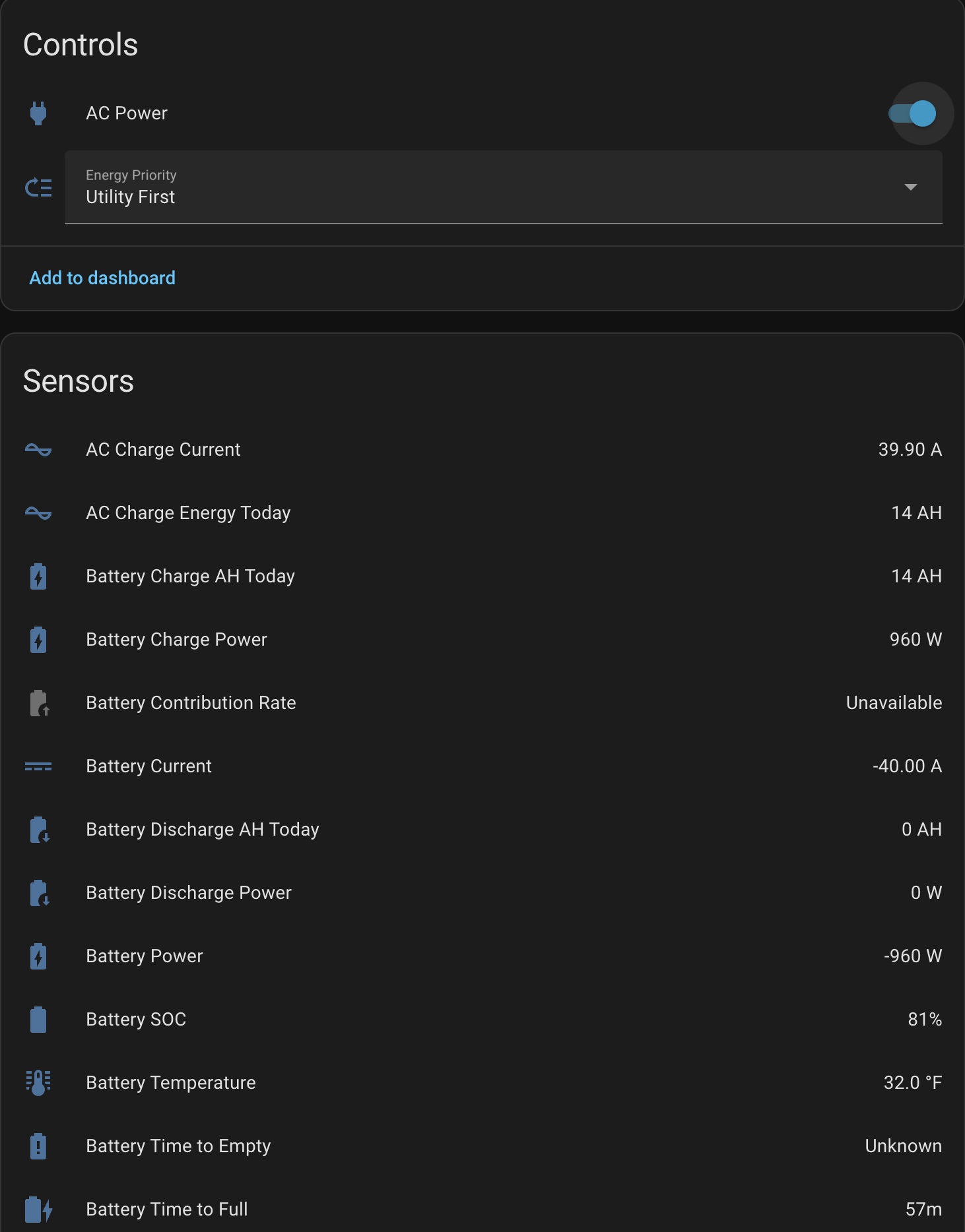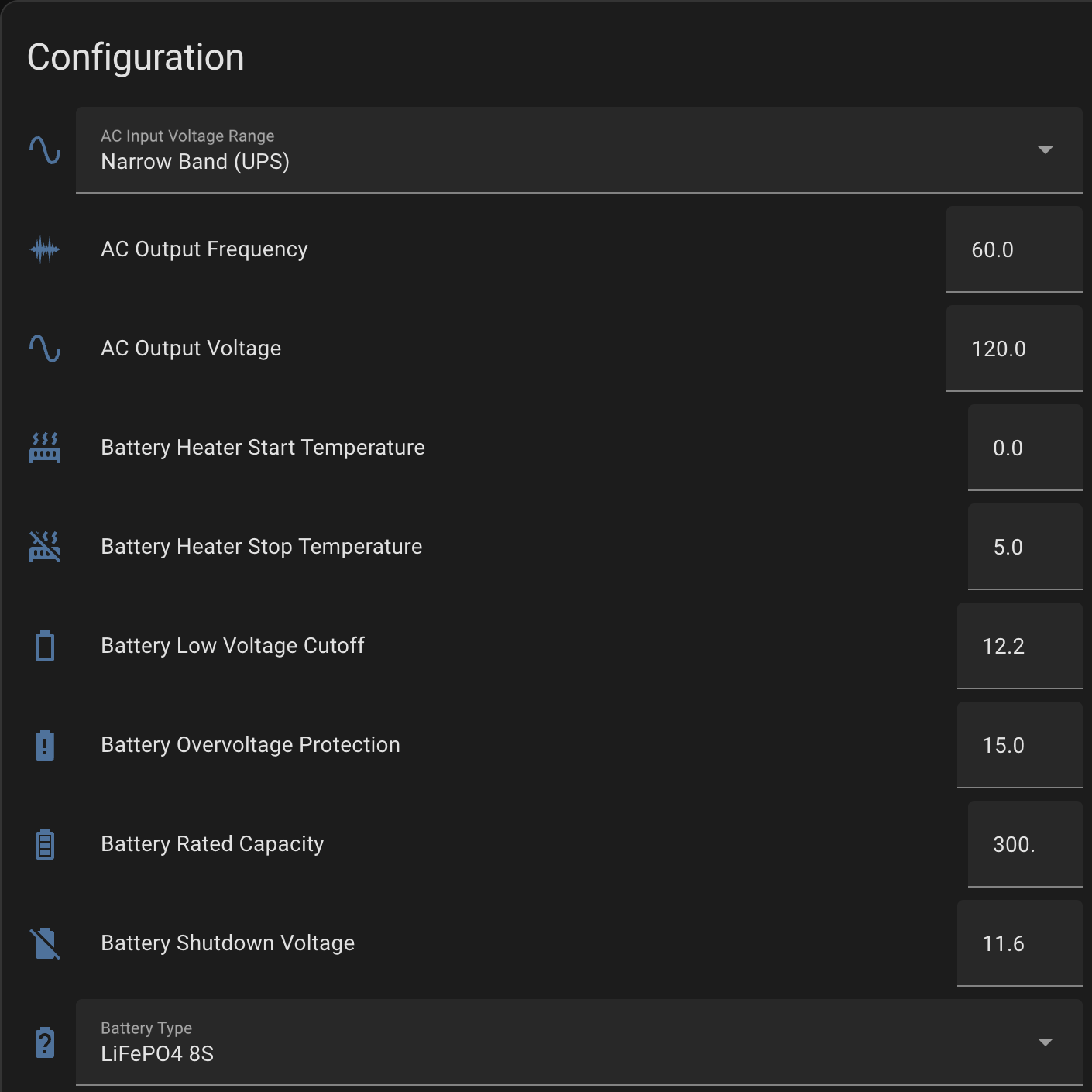 WARNING This is a Work in Progress and has undergone very little testing. Because this integration can change hardware settings (like charging voltages and currents), there is a real risk of equipment damage if used improperly. Use at your own risk.