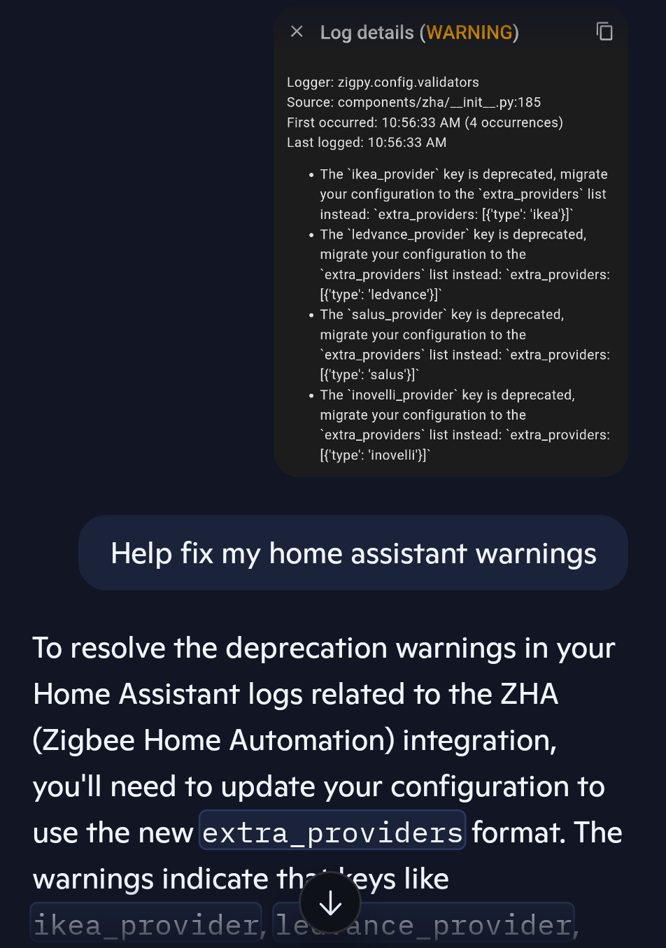 Ok, fixed it. I looked in the logs and saw warnings for ZHA. Took a screenshot of the warning and asked Copilot how to fix - see attached images from Copilot.