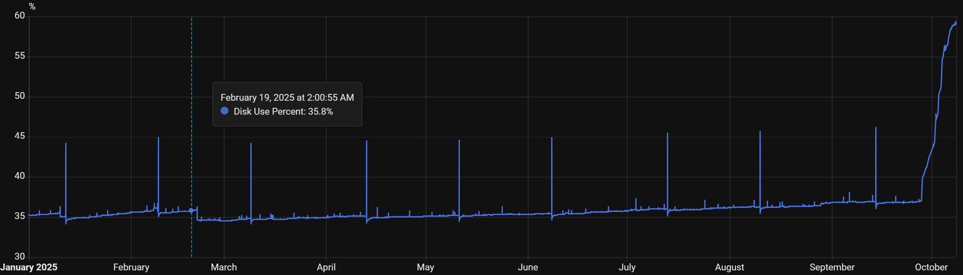 I have my system running on Ubuntu in a docker environment and it has been stable for over 2 years now. Now…since the 28th of September, my disk use has started increasing and I have no clue what the cause is or…where to start looking.