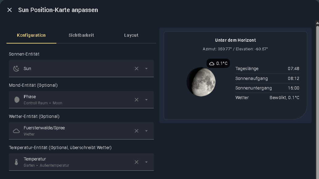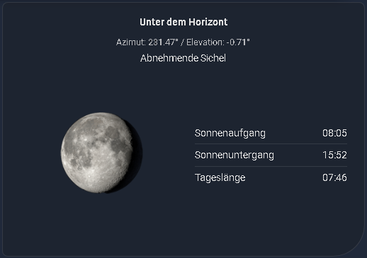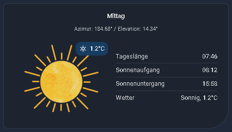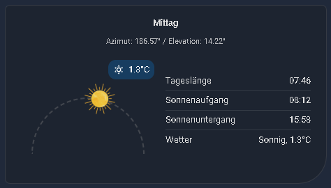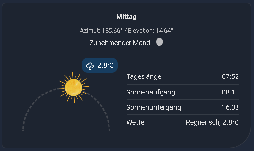 This is a custom Lovelace card used to visualize the current position of the sun with various configuration options, as well as the current moon phase and the display of additional relevant solar times. The Card is translated into English and German. (github page).